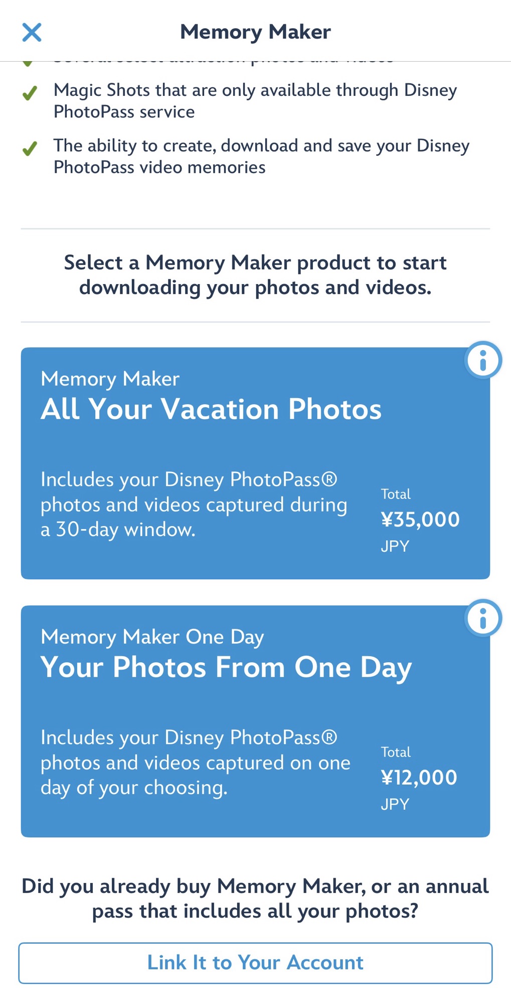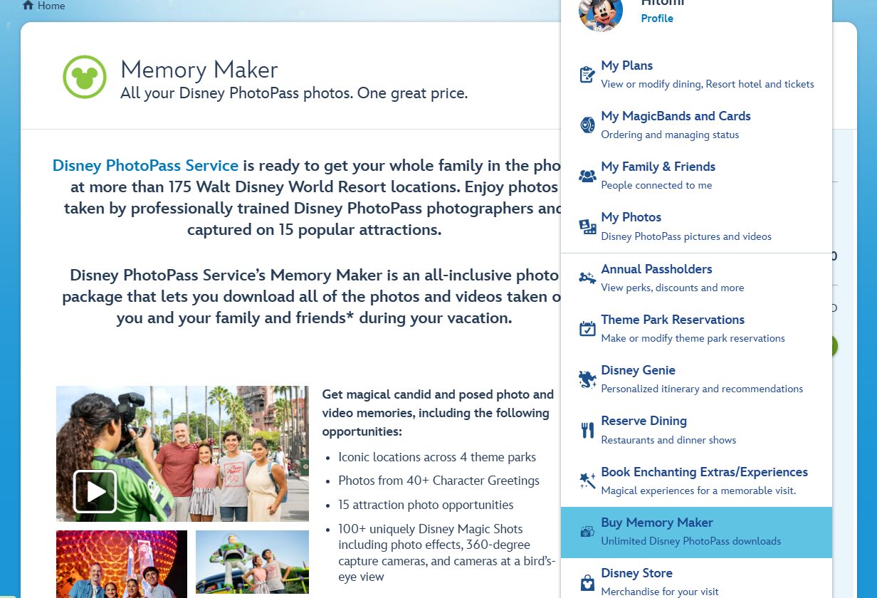 事前割引価格で購入したい場合は、My Disney ExperienceのBuy Memory Makerからアクセスします。